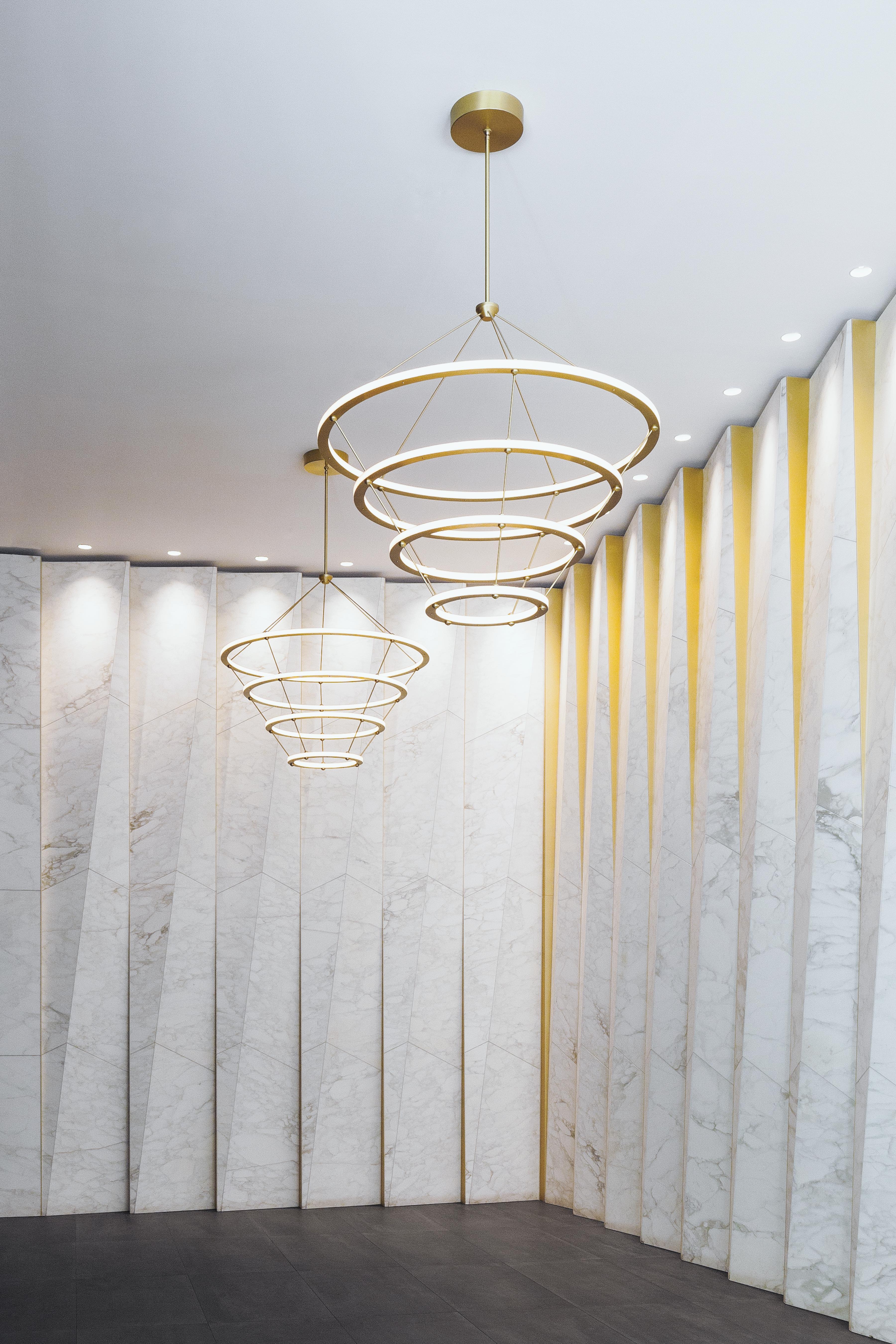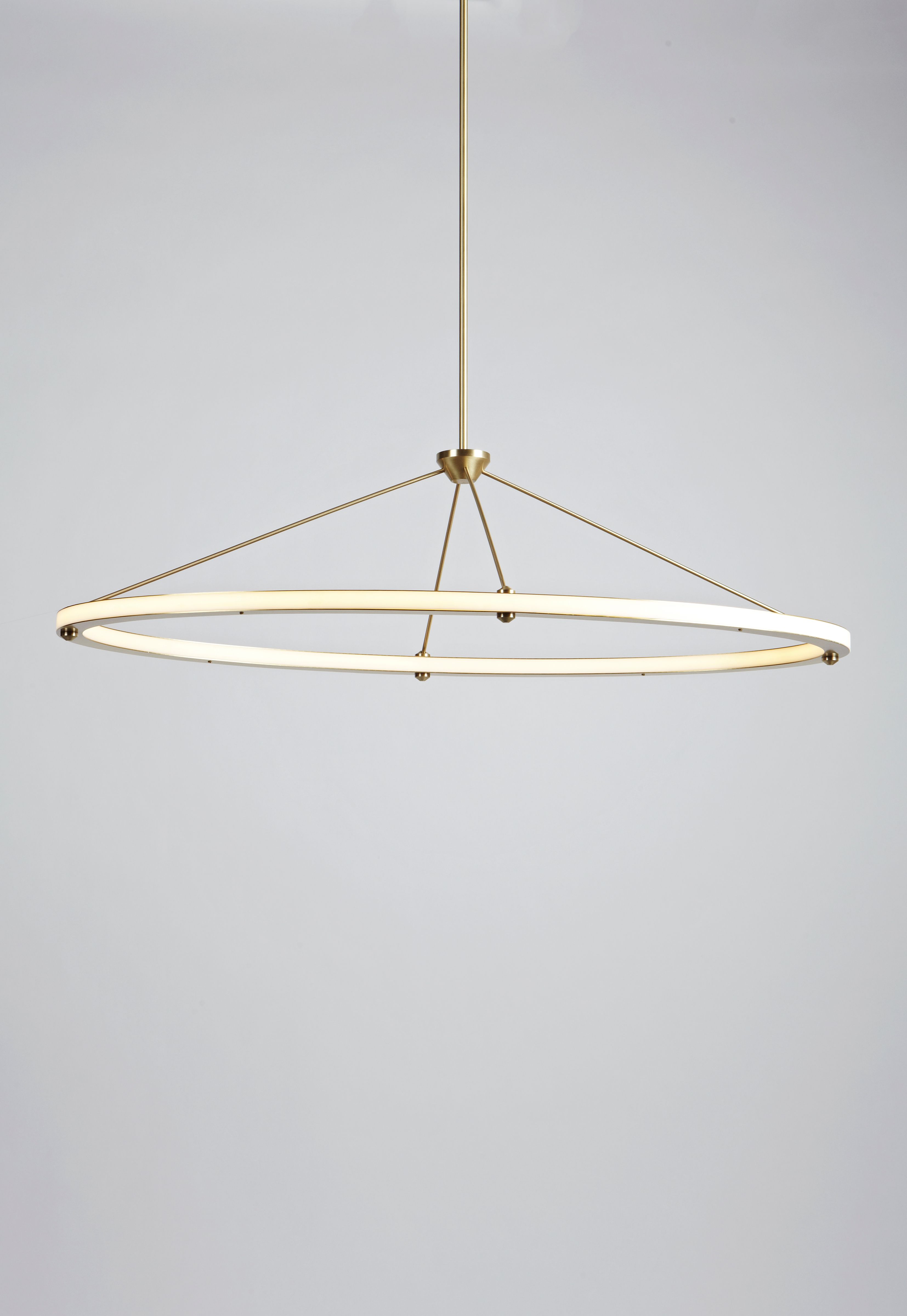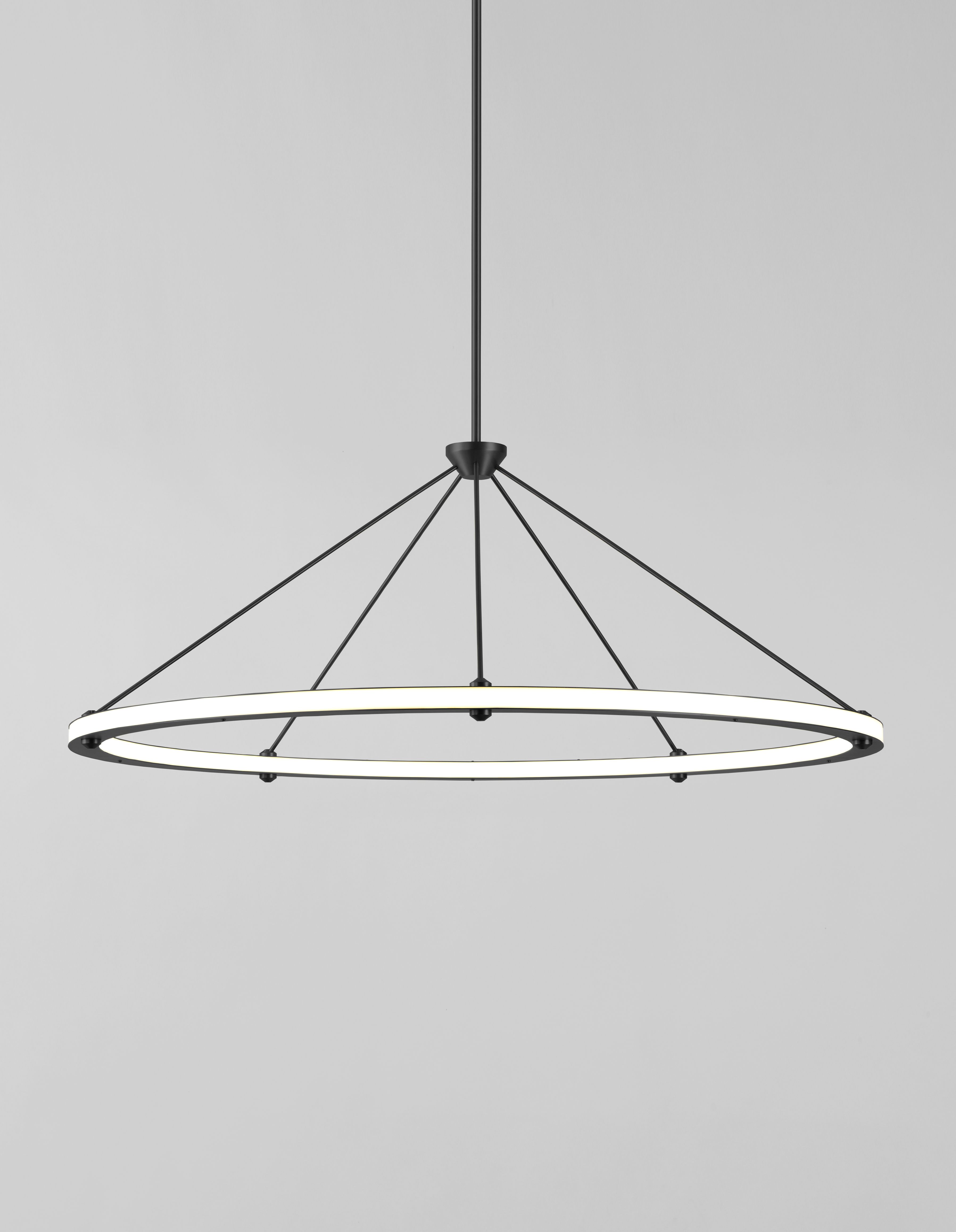 Halo is an LED lighting fixture with a minimal form. The concentrated intensity of the lighting allows for an elegant and reductive structure. The fixture is designed specifically to be suited to a variety of programs and scales including residential, hospitality, commercial, retail, and public. Available in a number of designs and finishes. Custom sizes, chandelier ring numbers, and orientations available upon request. Trade discounts available where applicable. Contact eva@loebachdesigns.com for more information. Designed by Paul Loebach for Roll & Hill.